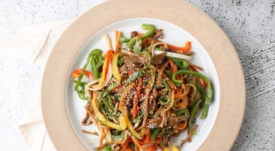 너무 얇지 않게 0.3~0.5mm 두께로 썰어주세요. 표고버섯은 슬라이스, 느타리버섯은 쭉쭉 찢어주고요파프리카도 채를 썰어줍니다. 당근으로 대체해도 되어요. 당근 굵게 채썰어 준비하시면 되어요. 시금치는 밑동제거 씻어서 준비, 시금치는 4~5 뿌리정도 한 줌 준비하시면 되어요. 시금치 대신 부추도 괜찮습니다. 초록색이면 대체 가능해요. 돼지고기를 이용하여도 밑간양념은 동일합니다. 채 썬 고기 200g당 진간장 1.5, 설탕 0.5, 참기름 0.5, 다진 마늘 0.5, 후추 약간 넣어 버무려 야채들 볶을 동안 양념이 배게 재워두세요.