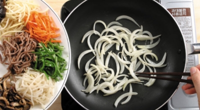 목이버섯은 물에 불려주며 시금치는 데친 후 소금, 참기름, 마늘을 넣어 조물조물 양념해 주어요. 식용유룰 달군 팬에 두르고 양파를 살아있는 씹는 맛을 살려 볶아줍니다, 소금 한 꼬집 넣어주며 양파와 잘 어울리는 후추도 솔솔 뿌려 볶아냅니다. 양파 볶아준 후 당근채를 볶아주며 대파도 볶아줍니다.