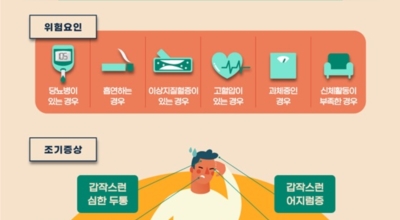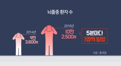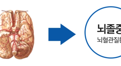뇌졸중 - 뇌에 혈액을 주는 역할을 하는 혈관이 막히거나 터져서 뇌훼손을 유발하는 상태