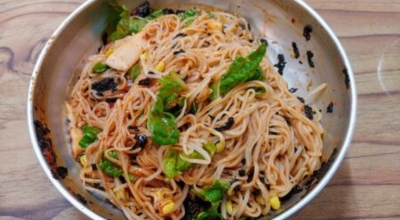 1인분 기준 설탕 1.5큰술, 고추가루 1/3큰술, 양조식초 2 큰술, 진간장 1/2 큰술, 다진마늘 1/2 큰술, 고추장 1 큰술을 넣고 잘라놓은 신김치도 넣어주며 마지막으로 참기름 한바퀴 두르고 마구 비벼주도록 해요. 신김치를 넣어 훨씬 맛을 업그레이드 시켰습니다. 그대로 그릇에 옮기고 고명을 올려주도록 해요.