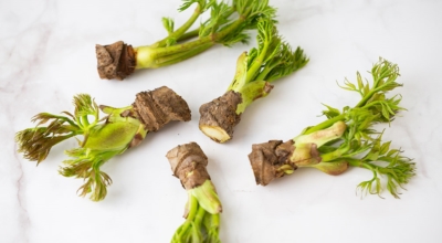 두릅은 다른 산나물에 대조해 떫은 맛이 적기 때문에 튀김으로 먹을 때는 떫은 맛이 불필요해요.그러나 무침이나 나물 등과 같은 요리로 할 경우는 쉽게 떫은맛을 내는 편이 맛있게 섭취할 수 있어요.먼저 두릅을 빨고 나면 줄기 부분을 덮고 있는 '하카마'라는 껍데기를 벗기세요. 뿌리의 갈색 부분을 깍을 만큼 잘라내면 자연스럽게 벗겨져요.