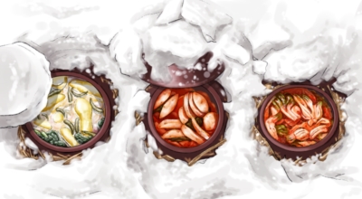 이 때 김장을 담그는 집에서는 돼지고기를 두어근 사다가 삶아놓고 배추의 노란 속잎과 양념을 준비하여 일하는 사람들이 먹도록 했습니다. 이것을 속대쌈이라 하며 지금도 미풍으로 전하여지고 있어요. 김장담그기가 끝나면 절인 배추나 남은 소를 나누어주고 겉절이를 나누어주기도 하여서, 가난한 집 부인들은 남의 집 김장을 도와주고 얻은 배추와 양념으로 김장을 하기도 했답니다.
